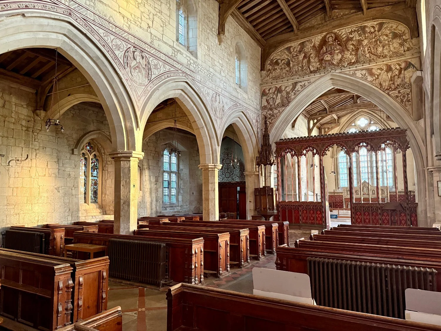 Stay the night. (£55 for sole occupancy of the church. Book ahead). Lie in darkness amidst the stillness of ancient stones. You will rarely have had, if ever, a grander place in which to sleep. As dawn illuminates the walls, you’ll see the ‘treasure house of delights.’ A dragon. A mermaid suckling a lion, an image of a medieval mason. A pre-Raphaelite God on his throne surrounded by Saints. Stained glass, a slender pulpit. A Medieval carved rood screen.