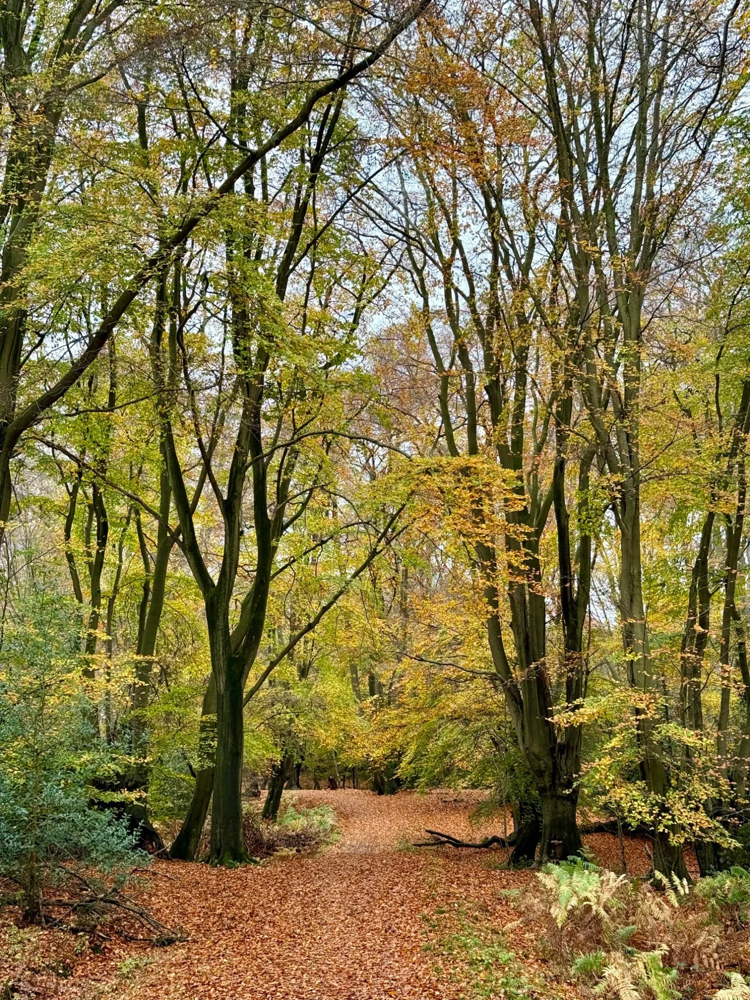 After eight kilometres of woods and commons, you enter the forest proper. The track becomes wide and with a firm base, which even in the depths of winter rides well. Beeches, oaks and hornbeam surround you with their pollarded trunks. The air is richly oxygenated, the canopies densely green, mulit-coloured or starkly grey like elephant’s skin, depending on the season. There is the absolute serenity of the forest too, unless you are crossing some of the busy roads which traverse the woodlands. There are deer sometimes seen in the shadows of the trees but no wild boar since they were hunted to extinction back in Saxon times.