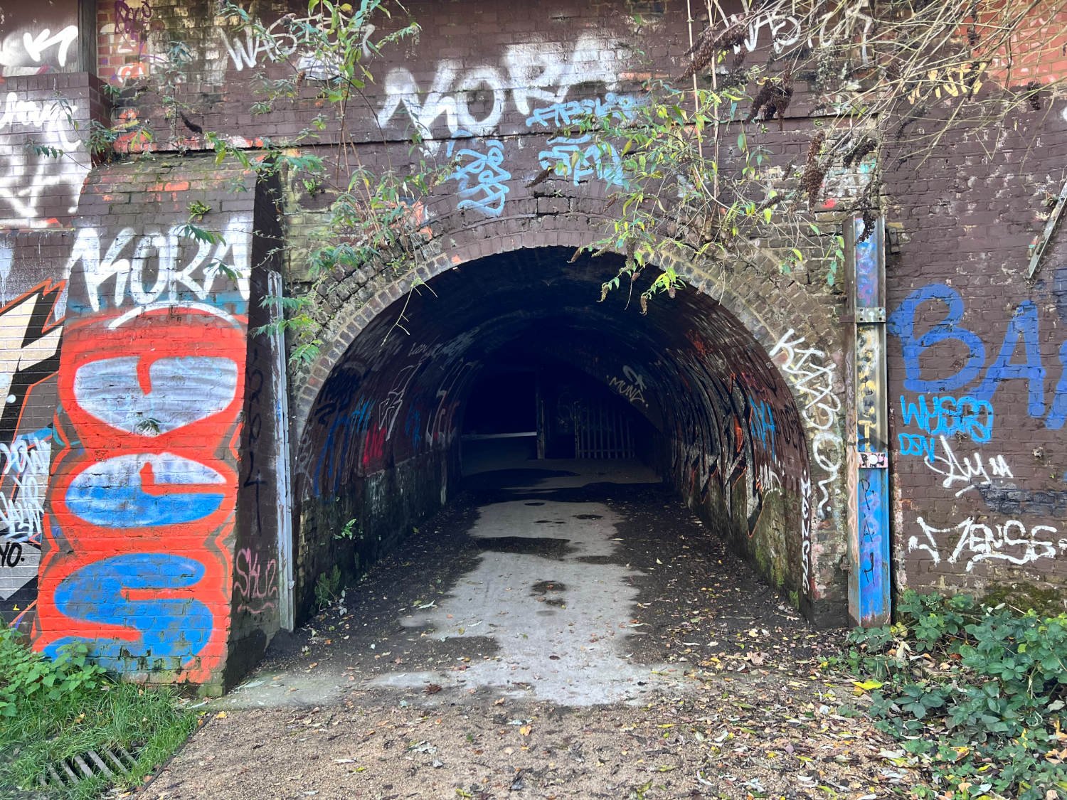 After a handful of floral, riverside riding, the route takes you into the underworld. You are ‘ingorged’ into darkness, into Hades itself. On your right is a 100m of suitably dark, dripping tunnel with an uneven surface and with a miniscule light at its far end. Bring a torch, leave the bike and explore, or continue riding on the path to the left, and ride 10m of tunnel before re-emerging into the light. Above you are the huge Feltham marshalling yards, built in 1917 by German prisoners of war.